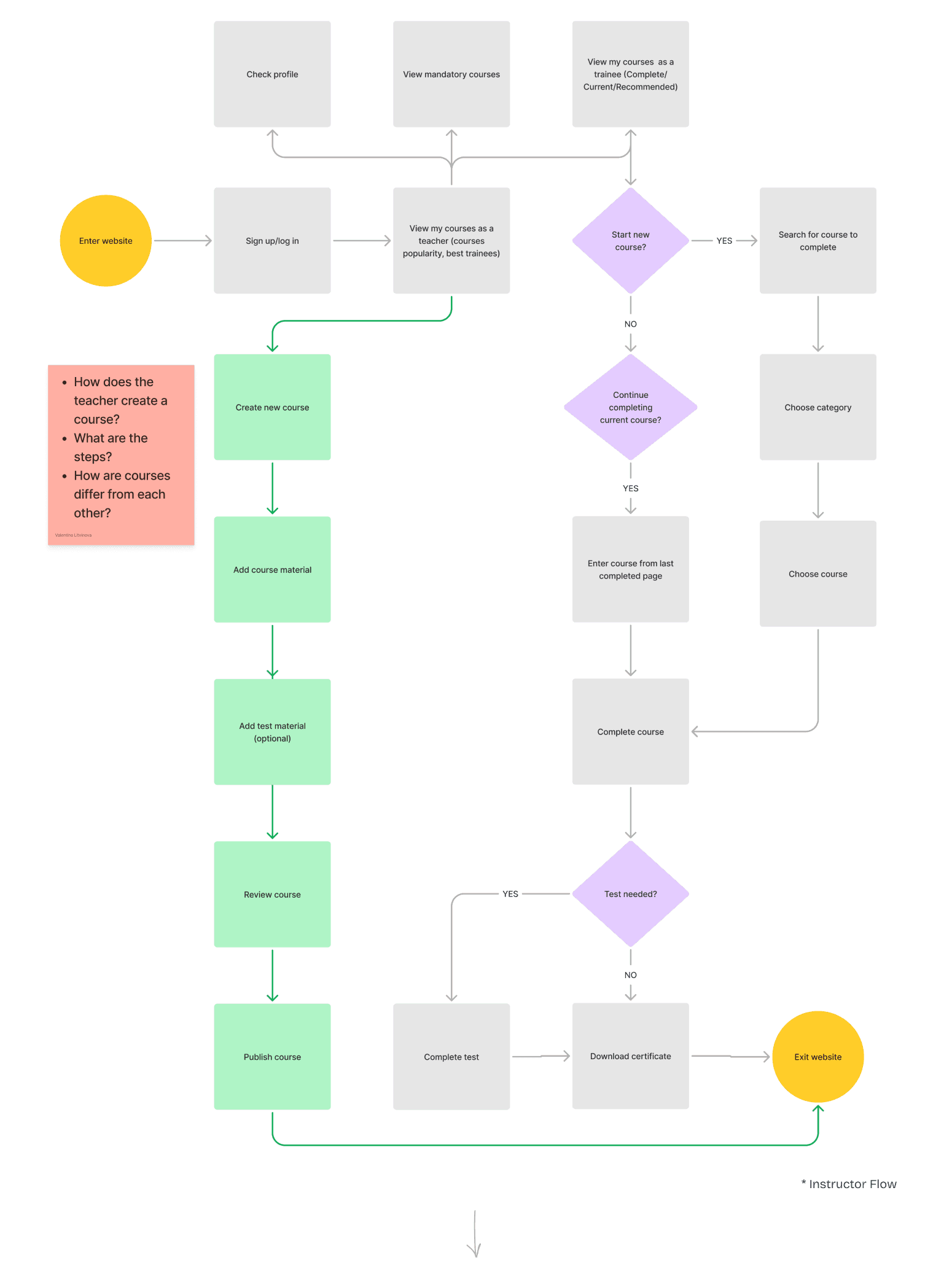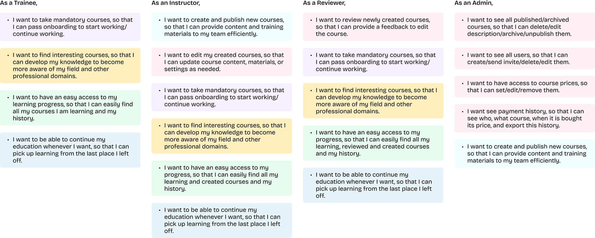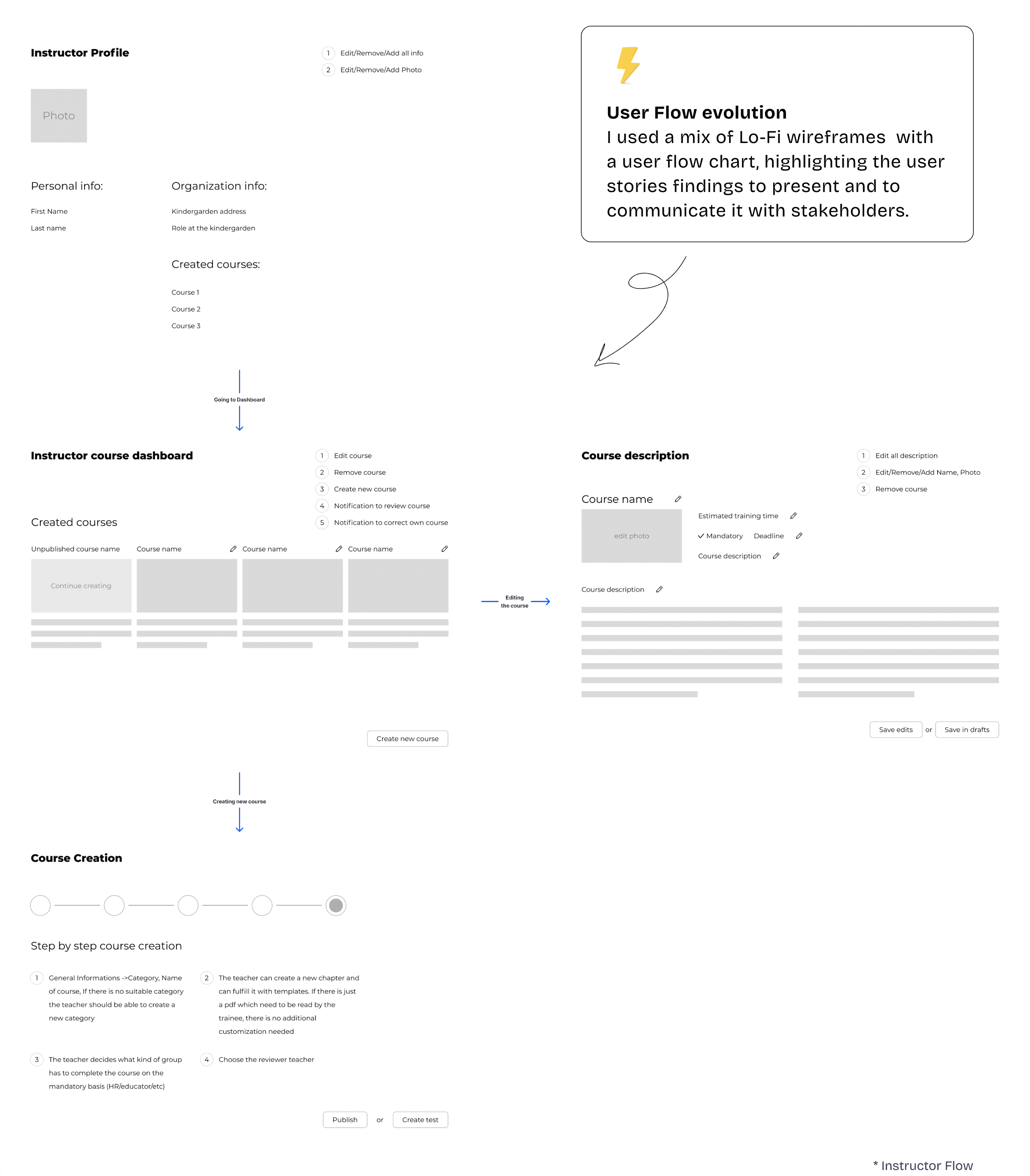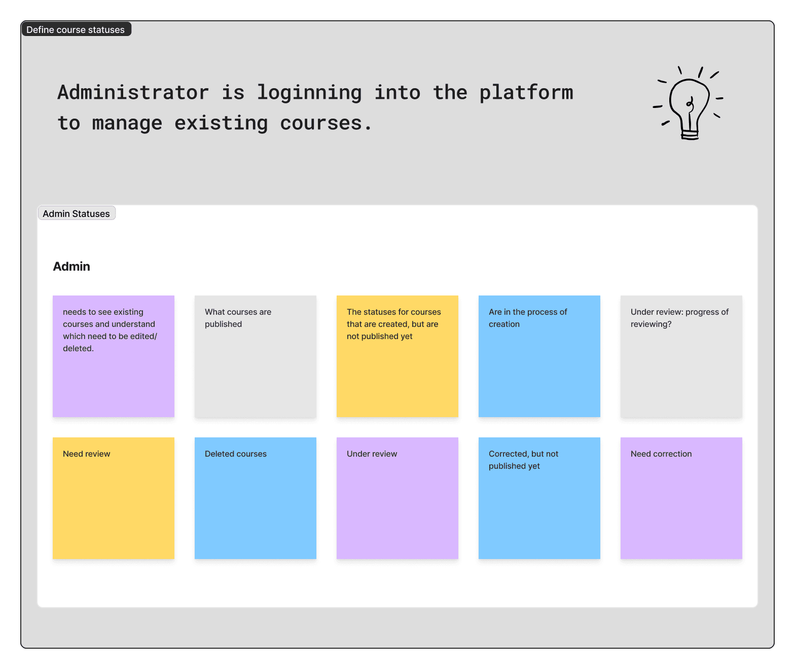 To keep users informed about the progress and status of their actions within a course, I facilitated a workshop with the BA/PM where we defined scenarios for each user type. This helped us to: