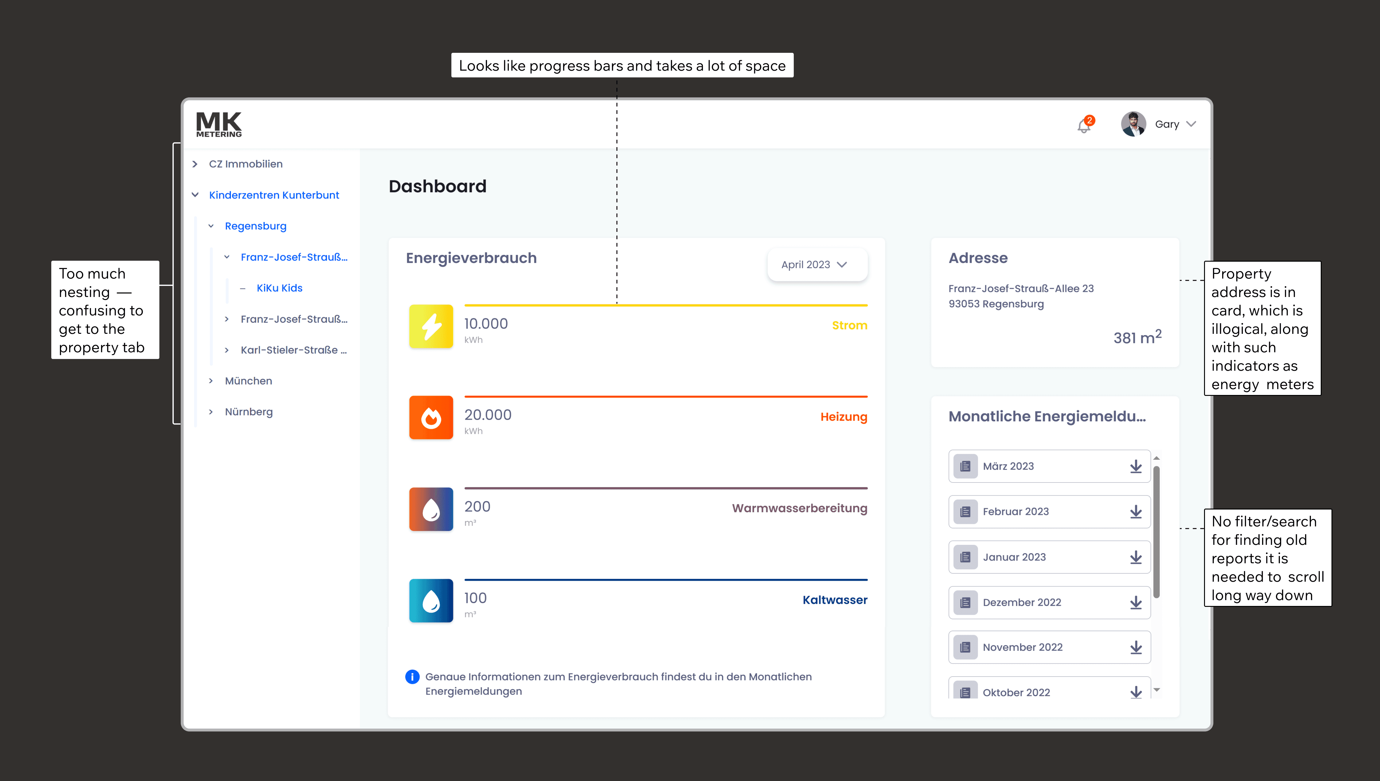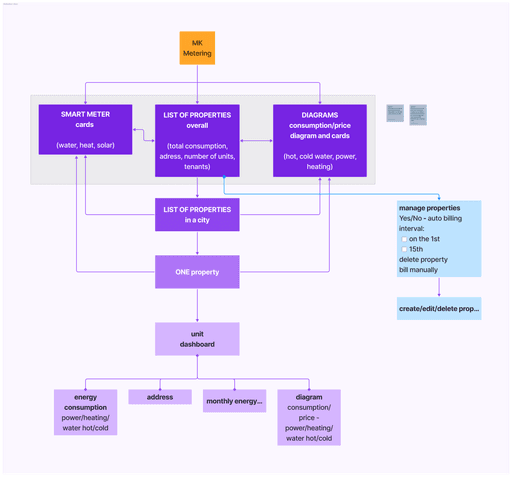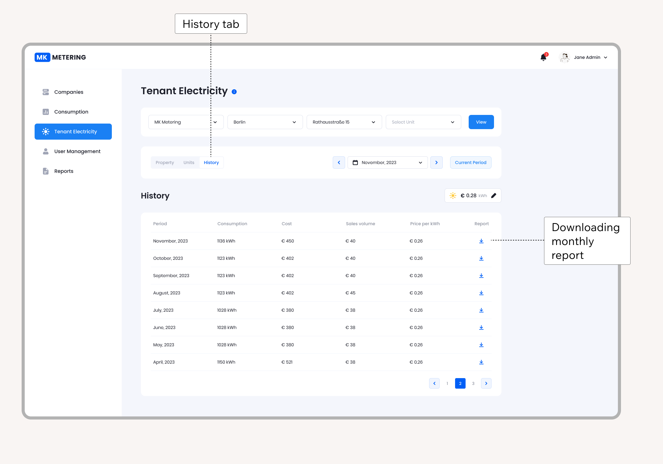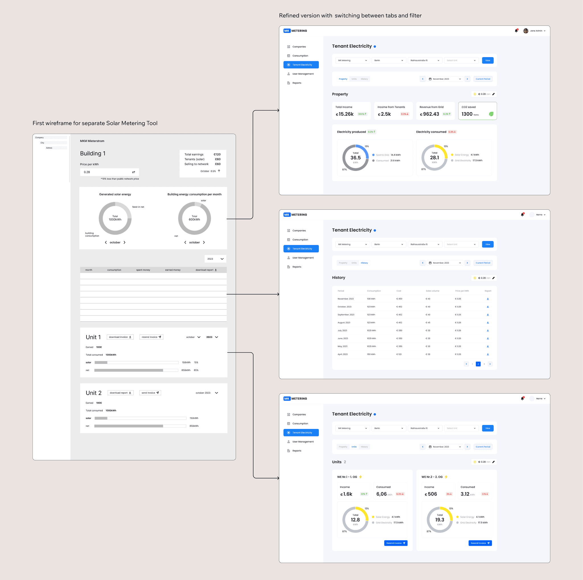 As I began designing the solar metering module (Tenant Electricity) in the initial phase, I encountered a challenge when the platform navigation underwent a full redesign. Since I had already laid the foundation with low-fidelity wireframes, I moved directly to high-fidelity designs, dividing the property, units, and history views into separate tabs within the dashboard.