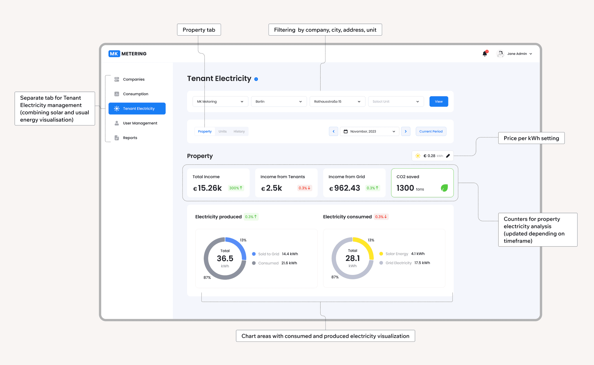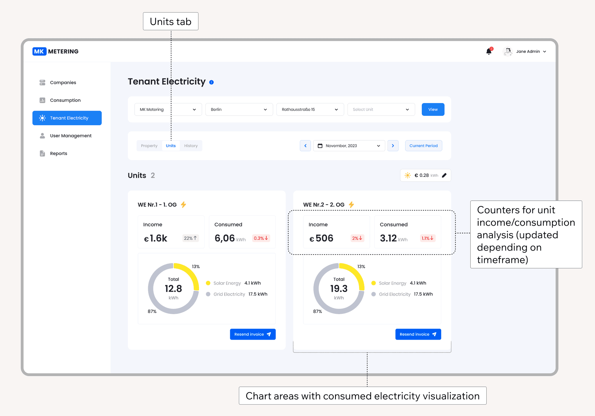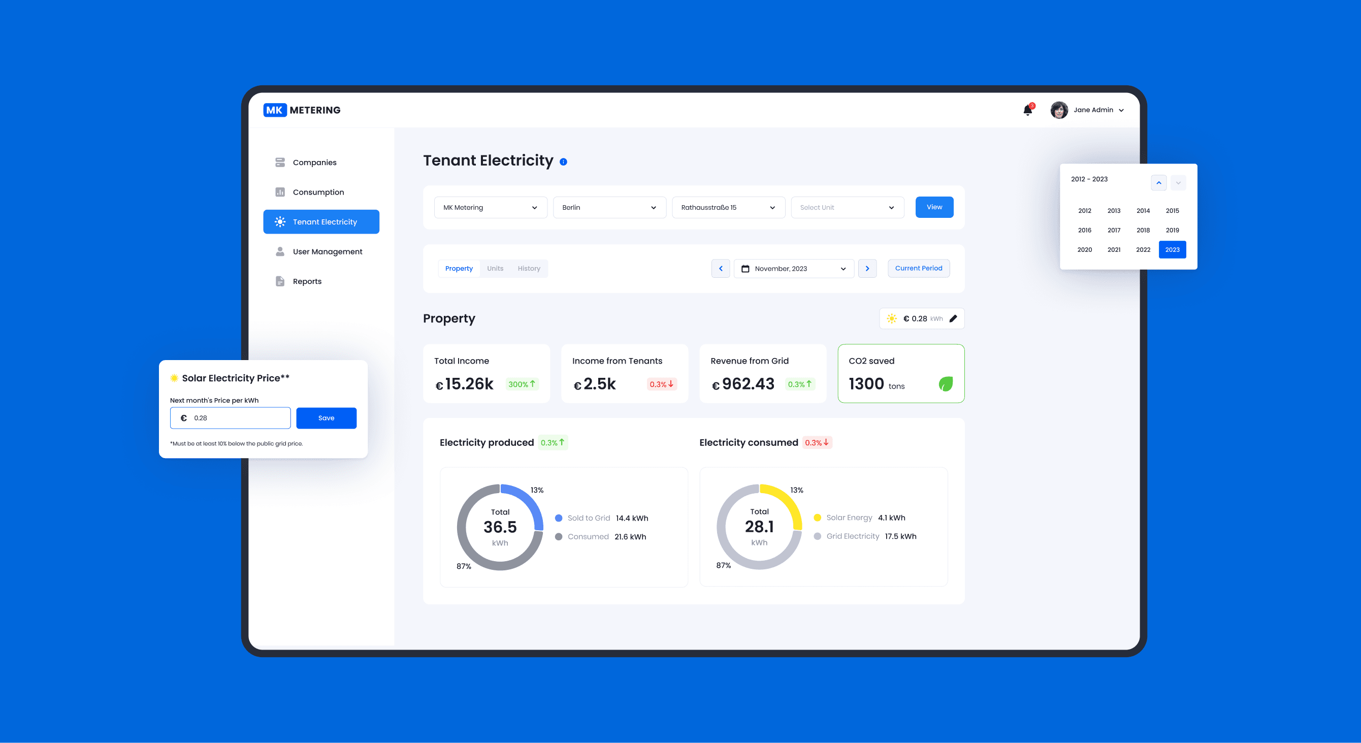 Tenant Electricity (Mieterstrom) is a dashboard, created to streamline solar energy management. Tailored to integrate into the existing MK Metering web app, it allows users to visualize and analyze energy consumption and production, generate automated monthly reports, and manage additional cost billing.